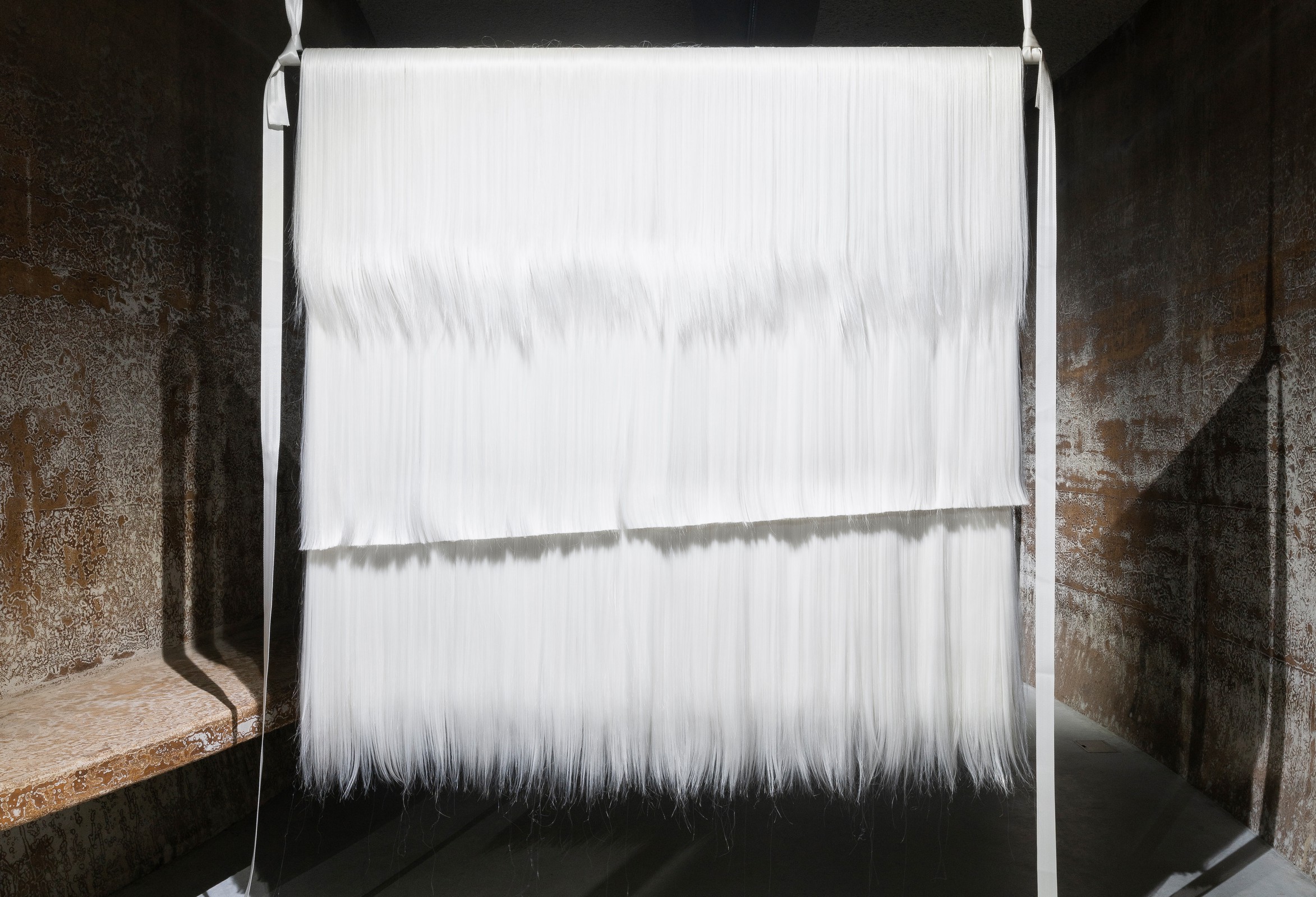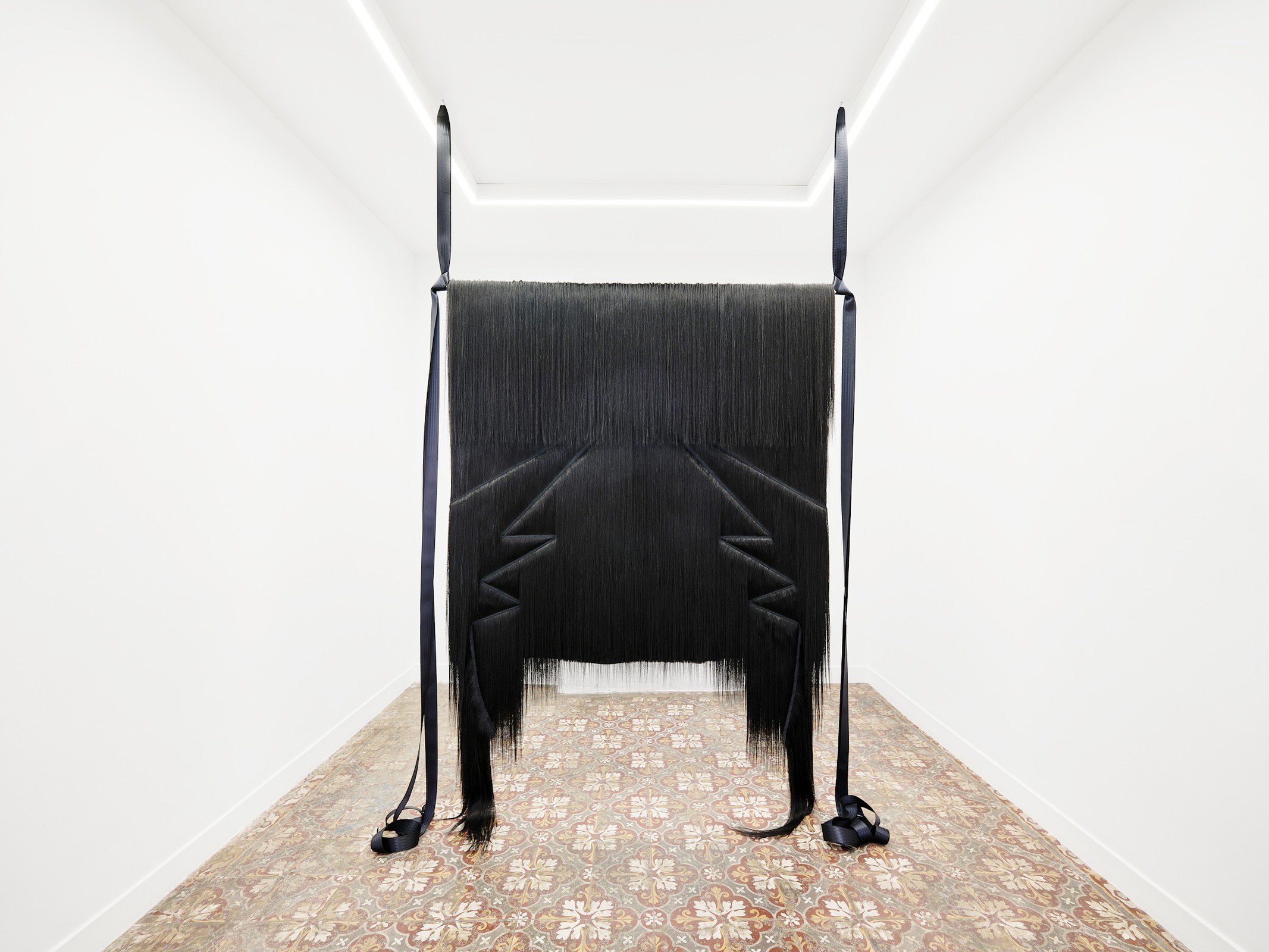 Works: Les Gayrillères, Installation with two-channel video (projection and curtain), 18 min., 2022, Microphone Piece (unconscious rehearsal) 2023, Wig Piece (kukeri III) 2021, Wig Piece (String Figure I), 2020, Dance Floor Piece (Walk Silently in the Dark Until Your Feet Become Ears I, II, III, IV), 2023, Wall Necklace Piece (The Burden of Life I, V, VII, IX, X), 2022, Wall Necklace Piece (Otherworldly I), 2022